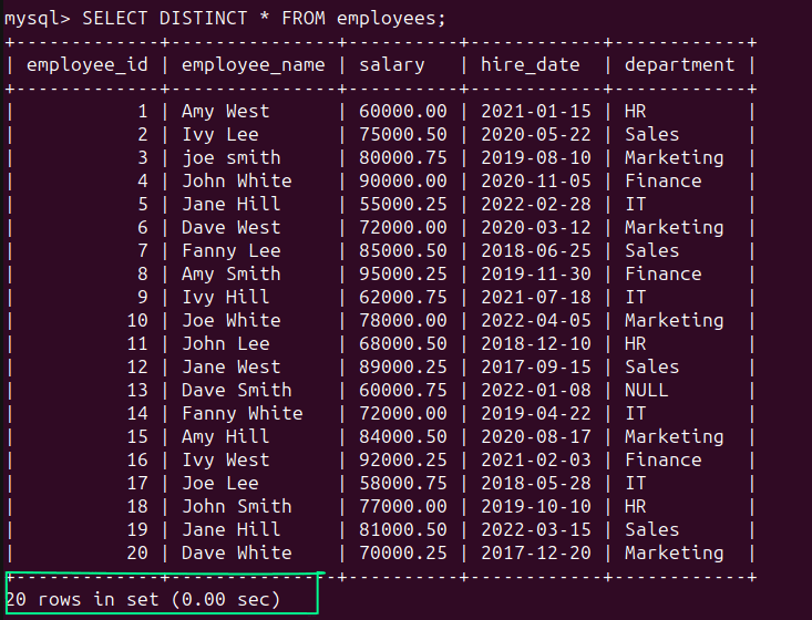 SELECT DISTINCT * FROM employees;如预期所示,结果集包含了所有的20条记录: