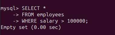SELECT *FROM employeesWHERE salary > 100000 ;如图所示,salary列中的所有条目都是有效的。因此,结果集为空:
