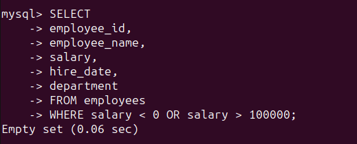SELECT employee_id, employee_name, salary, hire_date, departmentFROM employeesWHERE salary < 0 OR salary > 100000 ;如图所示,salary列值都在0和100000之间。因此,结果集为空: