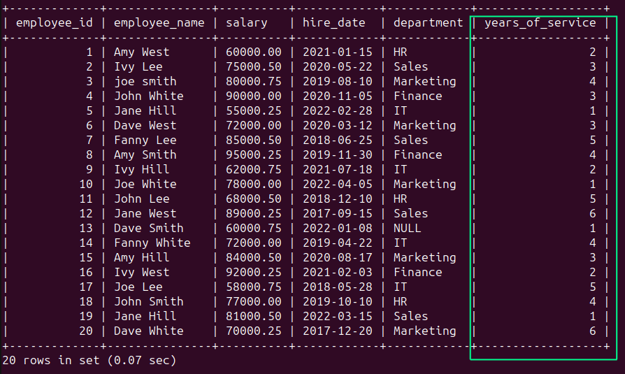 SELECT employee_id, employee_name, salary, hire_date, department, YEAR (CURDATE ()) - YEAR (hire_date) AS years_of_serviceFROM employees;应该会看到以下输出:
