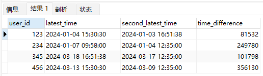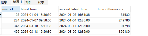 -- 第一步:找出每个用户的最近一次交易时间 WITH LatestTransactions AS ( SELECT user_id, MAX(transaction_time) AS latest_time FROM transactions GROUP BY user_id ), -- 第二步:剔除最近一次交易时间后,找出每个用户的最近一次交易时间(即倒数第二次) SecondLatestTransactions AS ( SELECT t.user_id, MAX(t.transaction_time) AS second_latest_time FROM transactions t LEFT JOIN LatestTransactions lt ON t.user_id = lt.user_id AND t.transaction_time = lt.latest_time WHERE lt.latest_time IS NULL OR t.transaction_time < lt.latest_time GROUP BY t.user_id ) -- 第三步:将两个子查询结果关联起来,并计算时间差 SELECT lt.user_id, latest_time, second_latest_time, TIMESTAMPDIFF(SECOND, slt.second_latest_time, lt.latest_time) AS time_difference FROM LatestTransactions lt JOIN SecondLatestTransactions slt ON lt.user_id = slt.user_id;