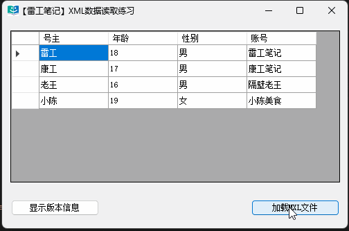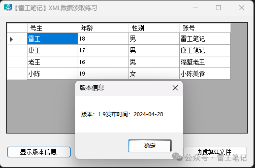 <?xml version="1.0" encoding="utf-8" ?><Authors> <Author> <AutName>雷工</AutName> <AutAge>18</AutAge> <Gender>男</Gender> <Account>雷工笔记</Account> </Author> <Author> <AutName>康工</AutName> <AutAge>17</AutAge> <Gender>男</Gender> <Account>康工笔记</Account> </Author> <Author> <AutName>老王</AutName> <AutAge>16</AutAge> <Gender>男</Gender> <Account>隔壁老王</Account> </Author> <Author> <AutName>小陈</AutName> <AutAge>19</AutAge> <Gender>女</Gender> <Account>小陈美食</Account> </Author> <Edition> <EdiInfo ediNO="1.9" ediTime="2024-04-28">版本信息</EdiInfo> </Edition></Authors>