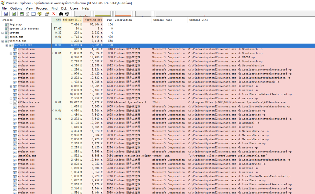 首先,我们来了解下什么是服务。在系统启动后,会有一个 services.exe 进程被启动,这个进程就是系统的服务控制管理器(SCM),由它启动的进程就是我们所说的服务。我们可以通过 ProcessExplorer 发现,所有的 svchost.exe 的父进程都是 Services.exe。也就是说,服务其实就是一组特殊的进程,这类进程的启动和运行完全不需要用户干预,会随着系统的启动而自动开始工作,为系统运行提供基础功能,比如网络服务、磁盘、键盘、鼠标等硬件管理服务。