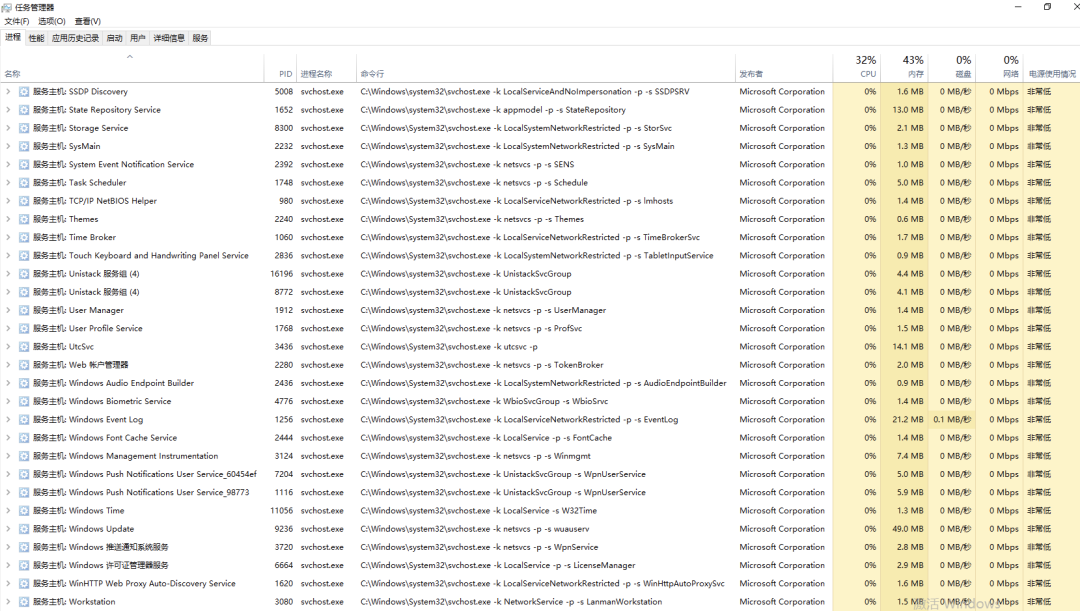 微软官方解释:svchost.exe 是从动态链接库 (DLL) 中运行的服务的通用主机进程名称。svchost.exe 是一个系统共享进程,我们可以把他理解为一个宿主或者容器,本身没有任何服务功能,Windows 操作系统将大部分的服务封装在了一个个 DLL 动态链接库中,想要启动哪个服务,就把服务所需的 dll 交给 svchost.exe,让 svchost 统一去加载启动就可以,这就是我们在查看进程时,会发现密密麻麻一大堆 svchost.exe 进程的原因。打开 Windows 任务管理器,我们看到的一堆名称为“服务主机”的进程,大部分都是 svchost.exe 启动的服务进程。当然,凡事都有例外,个别服务是通过直接注册可执行文件来实现,并不会通过 svchost.exe 这类进程调用。