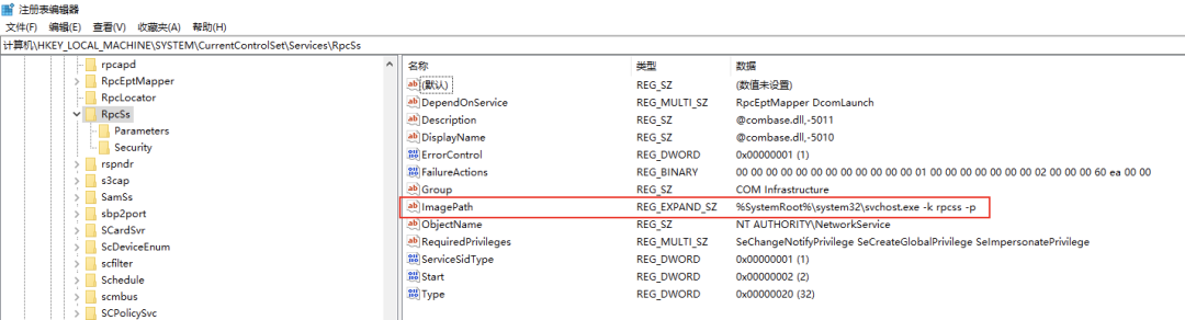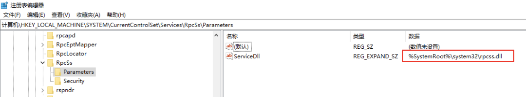 我们前面说过,系统服务是以动态链接库(dll)的形式实现的,因此,在“服务”注册表项中,以“RpcSs”服务为例,我们可以看到在“ImagePath”键中指定了此服务通过 svchost.exe 启动,那 svchost.exe 在执行时具体去哪里找实现这个服务的 dll 文件呢?答案就在该服务的子项“Parameters”的“ServiceDll”键值中记录。