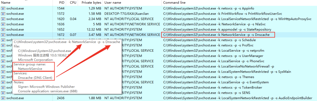 通过微步在线威胁检索工具发现两个可疑的 svchost 进程存在恶意 IOC 字符串在日常分析中,我们经常会通过抓取恶意域名请求来定位恶意进程,如果定位最终指向 svchost.exe 进程,而我们在查看进程命令行时,可以看到svchost -k NetworkService -p -s Dnscache 这样的参数,其实这是系统的 DNS 缓存机制:大部分应用程序进程进行域名解析时,会通过 RPC 传递到 Dnscache 服务进行 DNS 缓存(ipconfig /displaydns的结果就是他的功劳),而这两个服务都是通过 svchost.exe 启动的,因此并不代表该进程就是恶意进程。