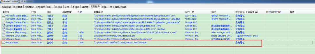 通过 Power Tool 发现无签名、无描述信息、启动目录可疑的 Metasploit 后门服务