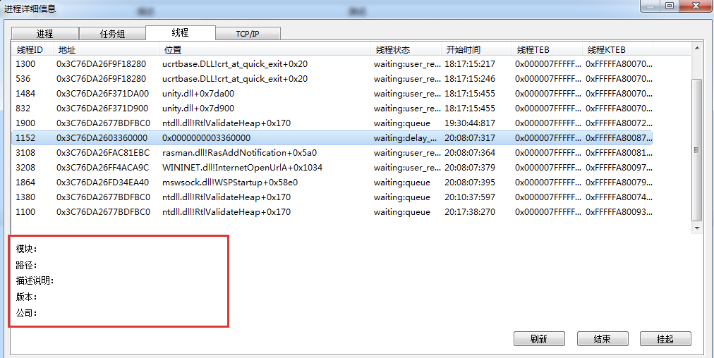 针对 dll 注入这类攻击手法,我们要了解 dll 注入的本质:在目标进程中增加一个线程,通过 LoadLlibrary 等方式来载入目标 dll。所以,我们可以着重从可疑进程的线程入手,查看是否存在没有描述及模块信息的可疑的线程。