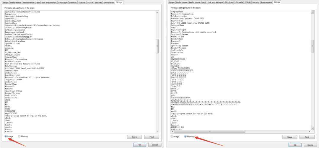 对于确认存在问题的恶意 svchost.exe 进程,如果没有发现加载可疑的 DLL 及可疑服务驻留,那么它可能就是一个傀儡进程,我们可以使用 ProcessExplorer 来对比查看其可执行文件字符串和内存字符串是否存在巨大差异,一般两者的内容是相同的,如果这两个字符串列表有很大差异,那么就很大概率说明发生了进程替换。