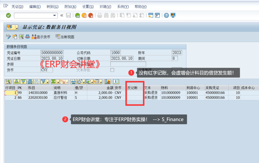 采购退货,系统不会红字记账,所以会虚增会计科目的借贷发生额,查看FI凭证如下: