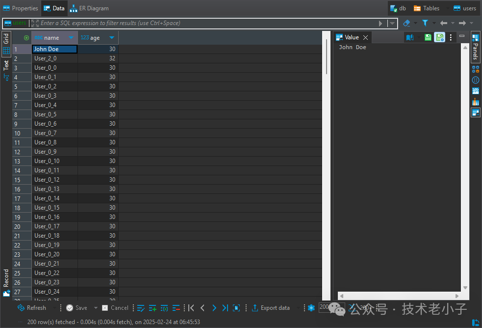 namespace AppLiteSql { internal classProgram { static async Task Main(string[] args) { AdvancedDatabaseManager dbManager = new AdvancedDatabaseManager("D:\\myproject\\11Test\\AppLiteSql\\db"); // 写入单个用户 var newUser = new User { Name = "John Doe", Age = 30 }; int newUserId = await dbManager.WriteUserAsync(newUser); // 批量写入用户 var userList = new List<User> { new User { Name = "Alice", Age = 25 }, new User { Name = "Bob", Age = 35 } }; await dbManager.BulkWriteUsersAsync(userList); // 读取用户 var users = await dbManager.ReadUsersAsync("Age > 20"); foreach (var user in users) { Console.WriteLine($"User: {user.Name}, Age: {user.Age}"); } // 更新用户 var updatedUser = new User { Name = "John Smith", Age = 31 }; await dbManager.UpdateUserAsync(newUserId, updatedUser); } } }