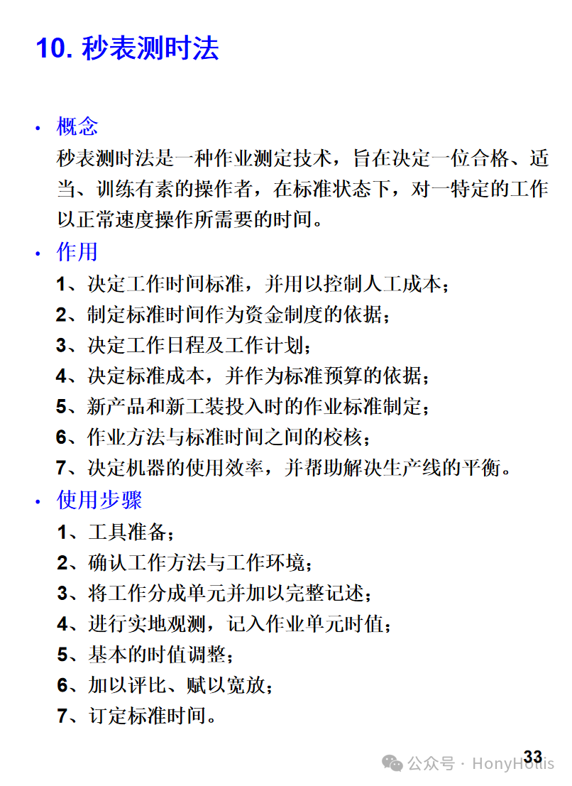 使用秒表测时法一般有七个步骤:首先准备好工具;接着确认工作方法和环境;然后将工作分解成单元并详细记录;进行实地观测并记录作业单元时值;之后进行基本的时值调整,再加以评比并赋予宽放,最终制定标准时间。其中,评比系数和宽放率的确定至关重要,它们分别综合了熟练程度、努力程度、工作环境等因素以及各类宽放情况。
