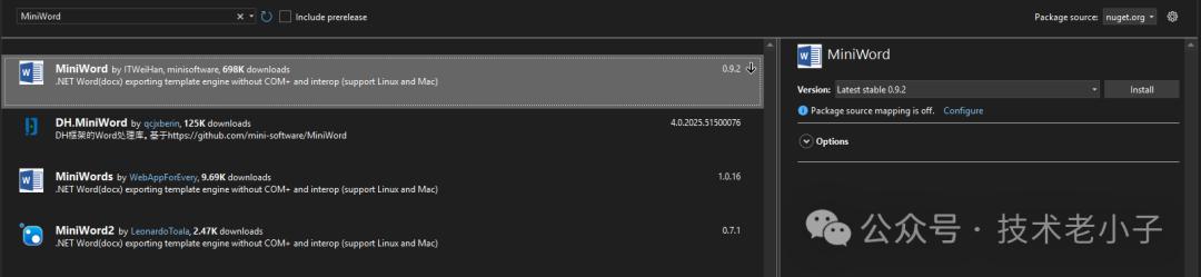 MiniWord通过NuGet包管理器提供,安装非常简单: