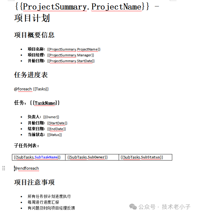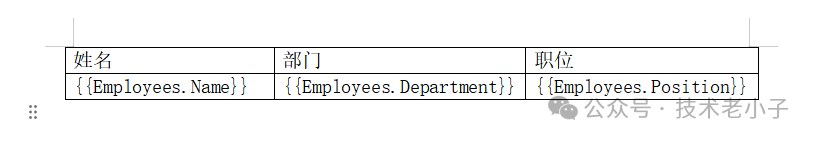 在Word模板中,你需要使用以下格式来定义表格行: