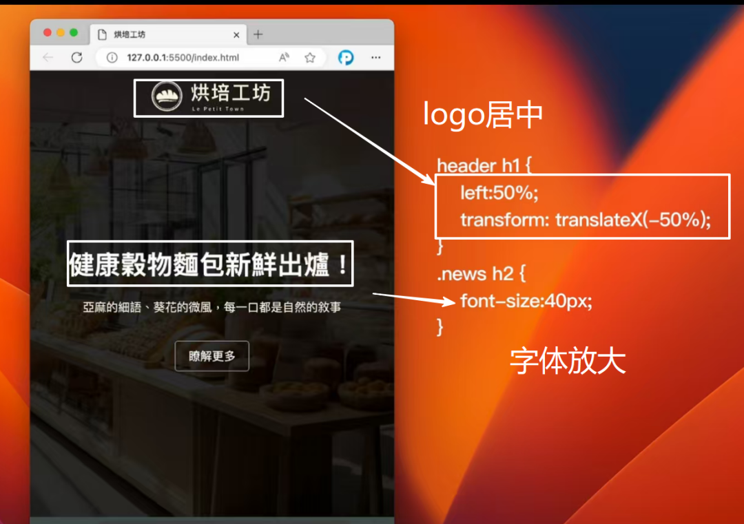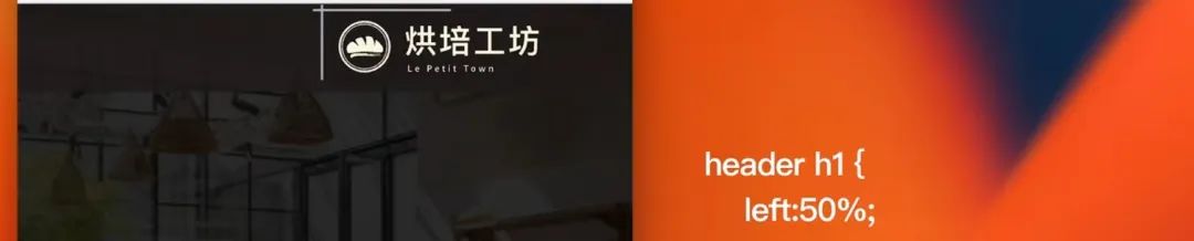作用:实现标题元素水平居中 1. left: 50%; ◦ 将 <h1> 元素的左侧边界定位到父容器(header)的水平中心点 ◦ ✘ 仅此操作会导致元素左边缘居中,而非元素本身居中