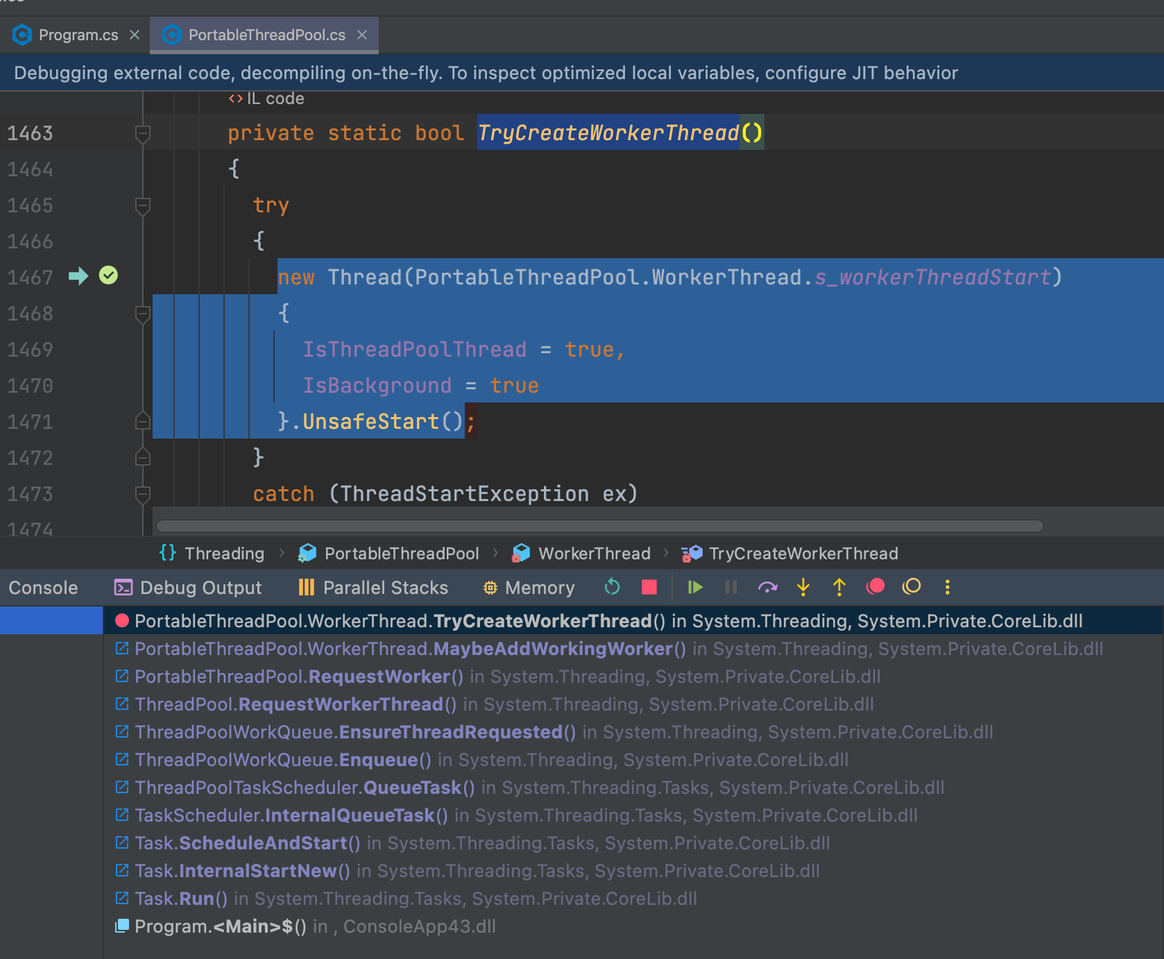在 PortableThreadPool.TryCreateWorkerThread 和实际要要执行的 lambda 表达式中打上断点,我们便可以清晰的看到整个执行过程。