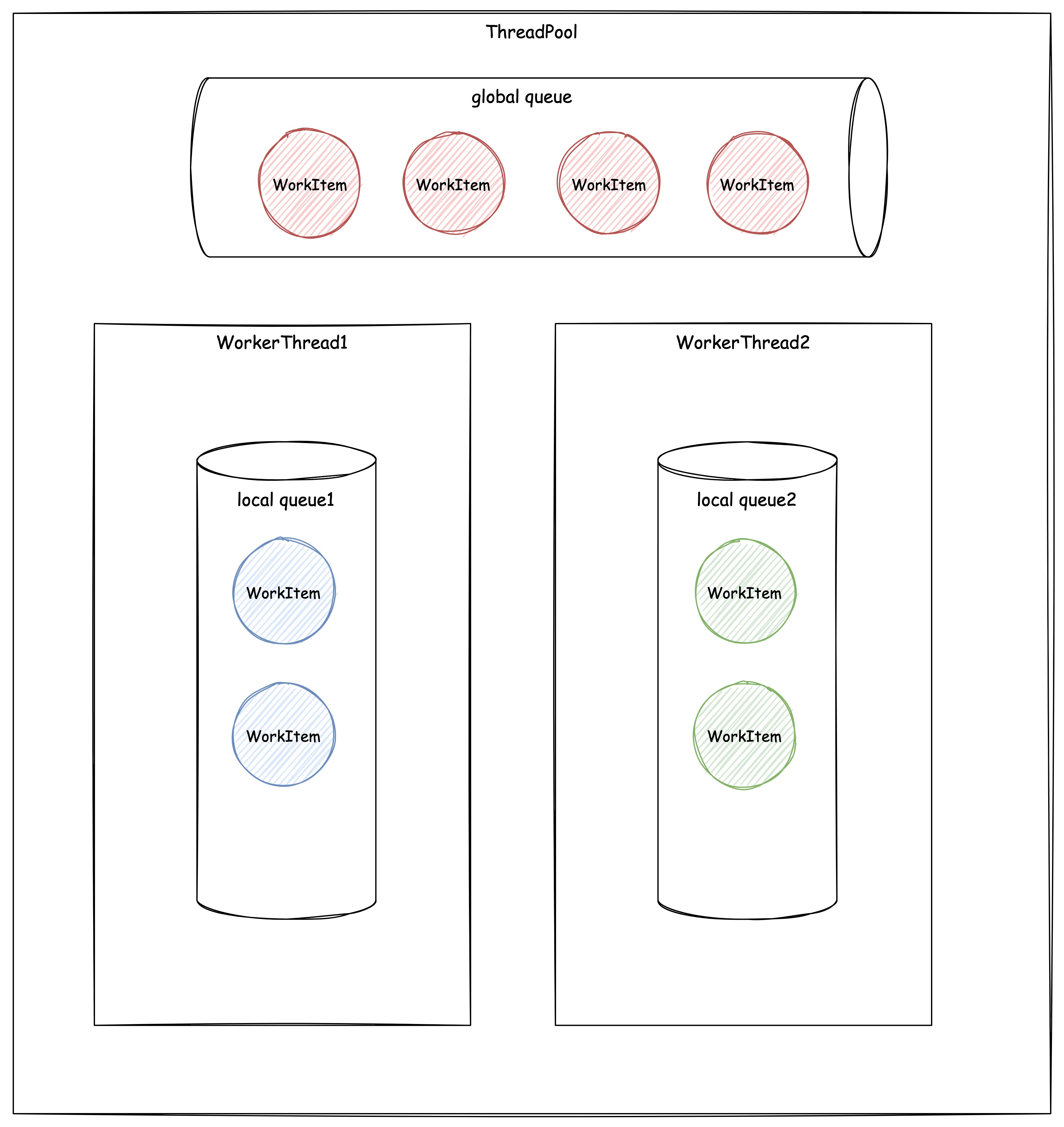 线程池的待执行任务被存放在一个队列系统中。这个系统包括一个 全局队列,以及绑定在每一个 Worker Thread 上 的 本地队列 。而线程池中的每一个线程都在执行 while(true) 的循环,从这个队列系统中领取并执行任务。