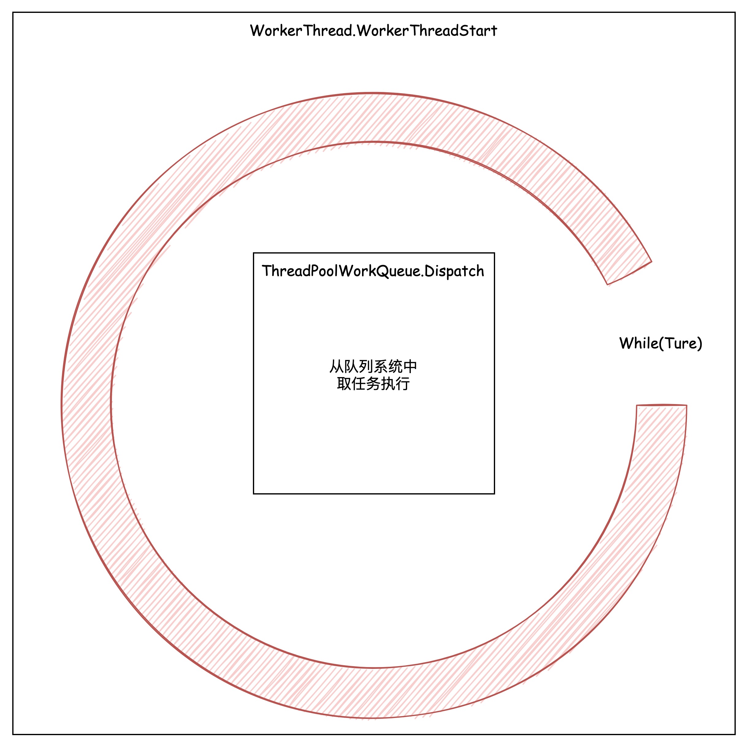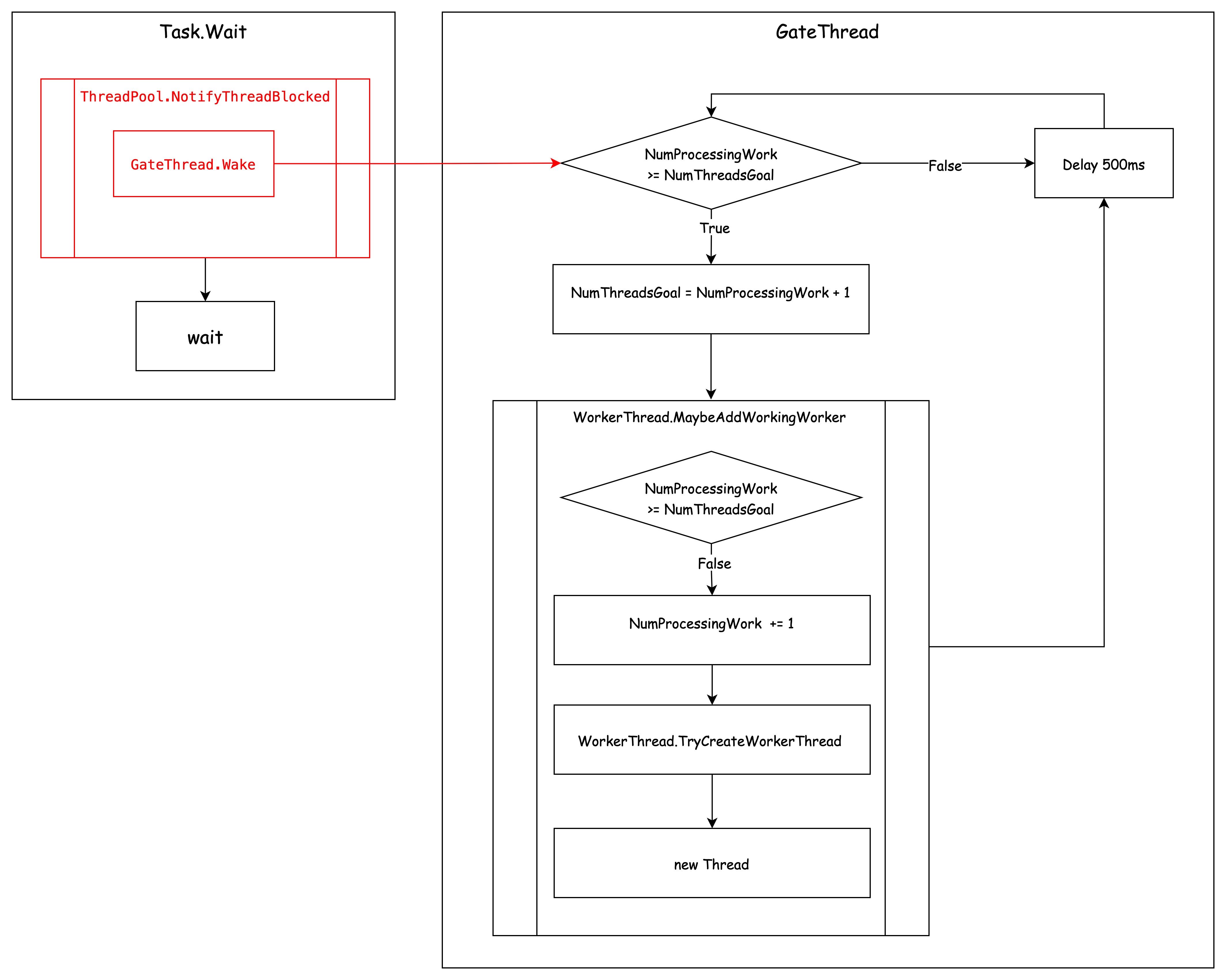 在 GateThread 是一个独立的线程,每隔 500ms 进行检查一下,如果 NumProcessingWork >= NumThreadsGoal(WorkerThread.MaybeAddWorkingWorker 不添加 Worker Thread 的判断条件),就设置新的 NumThreadsGoal = NumProcessingWork + 1,并调用 WorkerThread.MaybeAddWorkingWorker,这样新的 Worker Thread 就可以被 WorkerThread.MaybeAddWorkingWorker 创建。