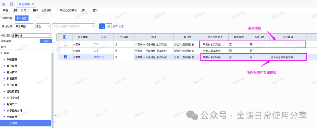 凭证模板关键字段说明如下: 1、适用账簿 若适用账簿为空,则表示为通用模版,所有组织所有账簿都适用。若适用账簿不为空,则表示仅指定账簿的个性化模版(因为不同的分公司可能业务流程不一样,需要单独设置)。生成凭证的顺序是先读取个性化模版,再读取通用模版。