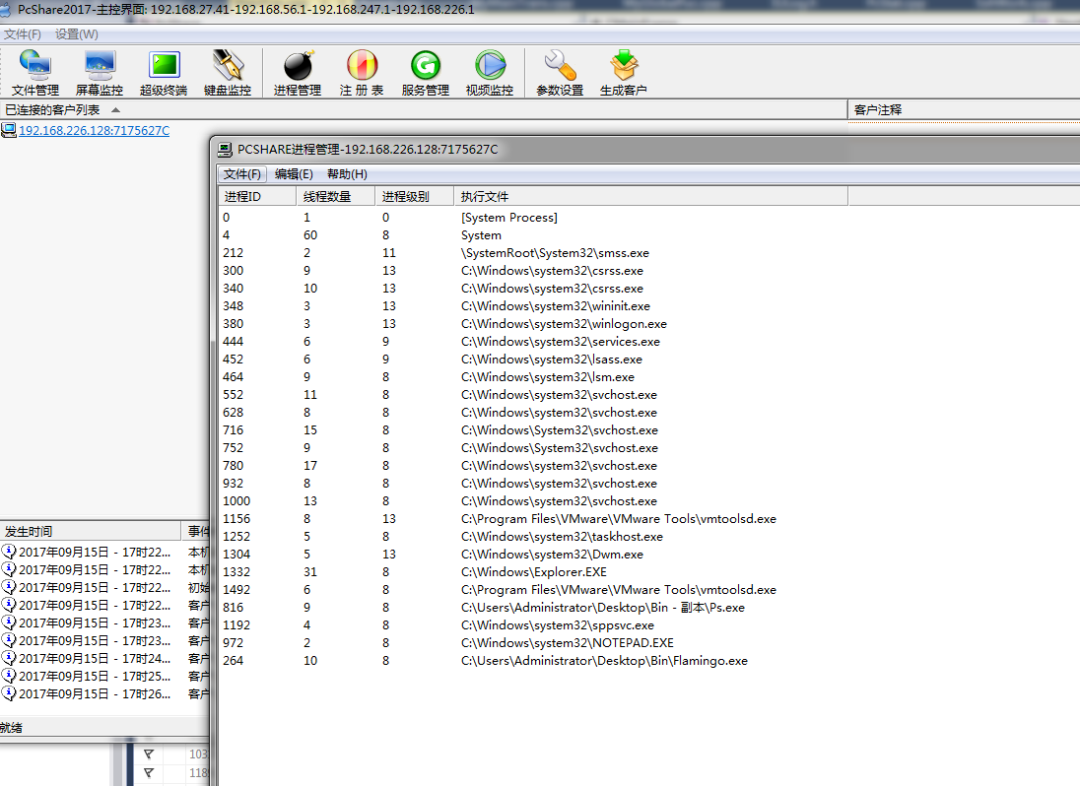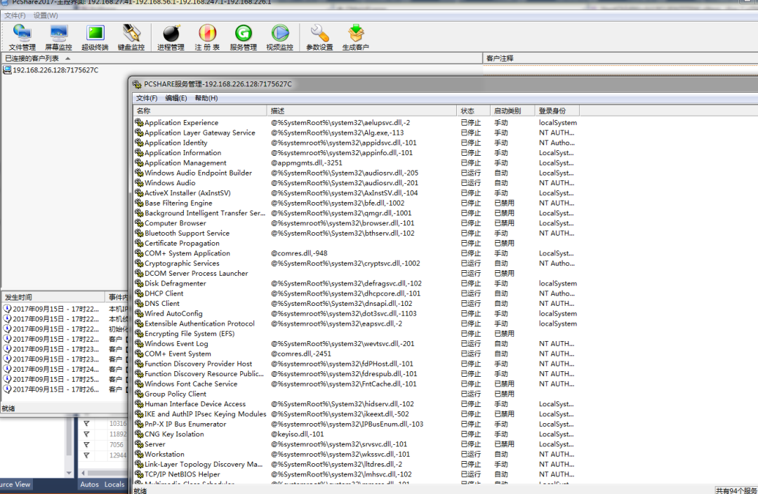 界面预览开始页: ![]() 监控和操作别人电脑: ![]() 查看和操作被控制电脑的进程: ![]() 查看被控制电脑服务程序: ![]() 如果别人电脑有摄像头,还可以打开监控摄像头: ![]() 操作介绍一、软件使用方法介绍: