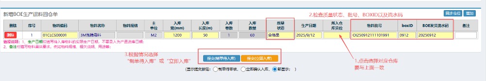 4.选好物料之后,按图操作:点击选择对应入库货位(要与上面一致),检查物料的质量状态、BOXID以及流水码。 然后根据情况选择提交“制单待入库”或“立即入库”。