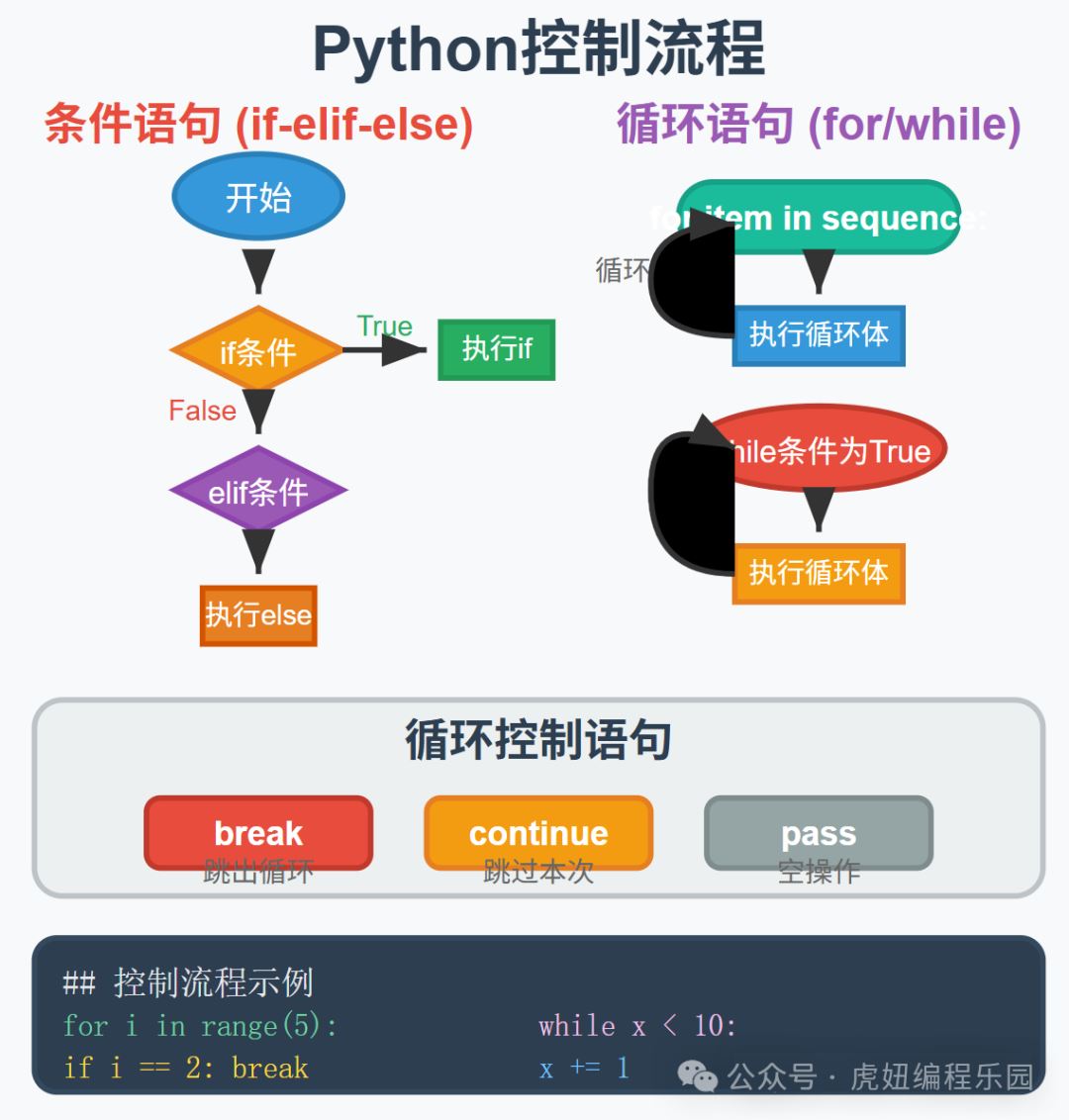 运算符:数学不好也能懂 ![]() Python中的运算符就像计算器上的按键,帮你做各种计算: 算术运算符:加减乘除这些 比较运算符:比较大小关系 逻辑运算符:并且、或者、非的关系 控制流程:让程序有“脑子” ![]() 程序不只能按顺序执行,还能根据条件做决定! 条件语句:如果...就... 这段代码的意思是:如果分数大于等于90,等级是A;否则如果大于等于80,等级是B;否则就是C。 注意哦,Python是用缩进来表示代码块的,一般是4个空格。这是Python的特色,也让代码看起来更整齐。 循环语句:重复的事情交给计算机 for循环:适合知道次数的循环 这会打印出0到4五个数字。 while循环:适合不知道次数但知道条件的循环 这段代码会一直执行,直到count不小于3为止。 函数:一劳永逸的智慧 ![]() 如果你有一段代码需要反复使用,那就把它写成函数吧! 函数可以有参数,也可以有默认值(比如上面的greeting="Hello")。这样你只需要写一次代码,就可以多次使用。 数据结构:数据的组织方式 ![]() Python提供了几种数据结构,就像不同的收纳工具: 列表(list):像购物清单,可以随时增删改 元组(tuple):像一次性打包的快递,不能更改内容 字典(dict):像真实的字典,通过关键词查找解释 集合(set):像数学中的集合,自动去重 异常处理:给程序上个保险 程序运行时难免会出错,好的程序应该能优雅地处理错误: 这样即使用户输入了错误的数据,程序也不会崩溃,而是给出友好的提示。 模块与包:站在巨人的肩膀上 Python最强大的地方在于有大量现成的模块可以直接使用: 除了Python自带的标准库,还有成千上万的第三方库可以通过pip安装,比如: