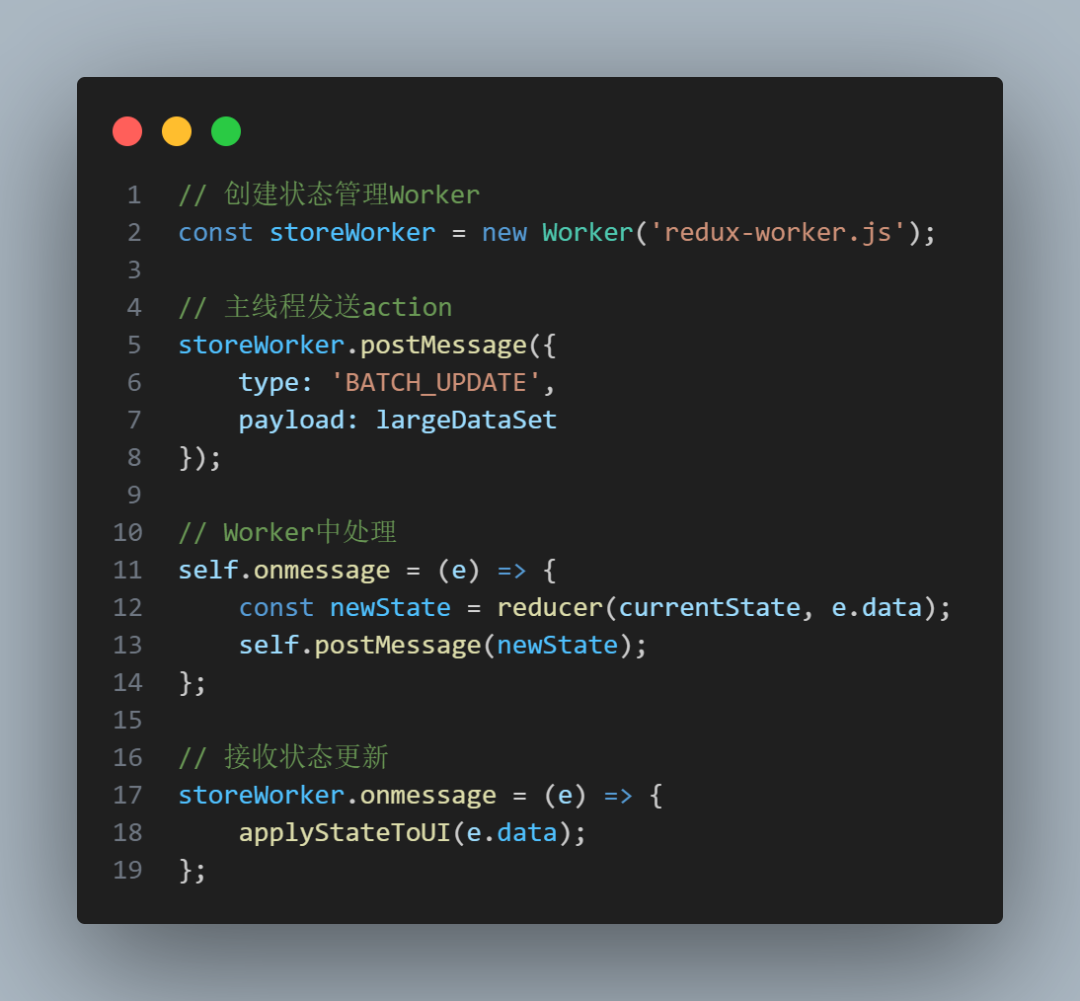 2.2 创建Worker的正确姿势主线程代码: ![]() worker.js代码: ![]() 2.3 性能对比实验结论: 虽然总耗时相近,但 WebWorker 将主线程阻塞时间降低了 99.8%! 三、实战:三个必须掌握的优化场景3.1 场景一:大数据可视化需求: 渲染10万条数据的热力图 ![]() heatmap-worker.js核心: ![]() 3.2 场景二:实时音视频处理WebRTC数据流处理: ![]() 3.3 场景三:复杂状态管理Redux性能优化方案: ![]() 四、高级技巧:Worker使用军规4.1 Worker线程的"三不原则"