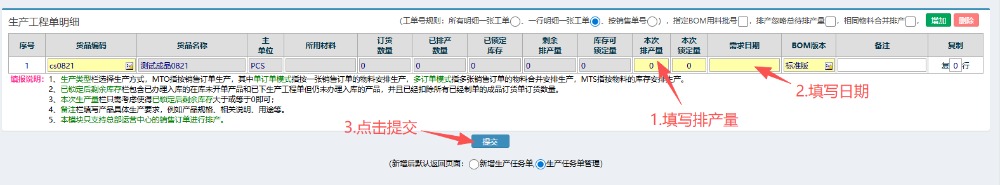 4.选好物料后,按图操作:填写排产量,填写日期,然后点击提交