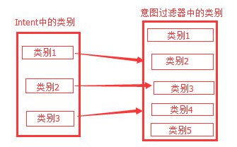对应<intent-filter>中的<category />标签; (1)Intent中的类别必须全部匹配<intent-filter>中的<category />,但是<intent-filter>中多余的<category />将不会导致匹配失败。 例如:Intent中有3个类别,而意图过滤器中定义了5个,如果Intent中的3个类别都与过滤器中的匹配,那么过滤器中的另外2个,将不会导致类别测试失败。
