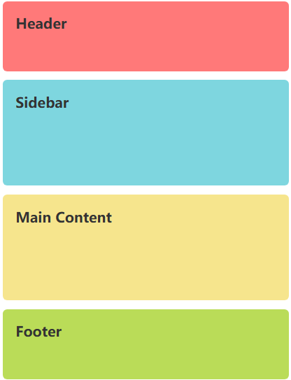 @media (max-width: 768px) { .container { grid-template-areas: "header" "sidebar" "main" "footer"; grid-template-columns: 1fr; grid-template-rows: 80px auto auto 80px; } } </style> <div class="container"> <header class="header">Header</header> <aside class="sidebar">Sidebar</aside> <main class="main">Main Content</main> <footer class="footer">Footer</footer> </div>