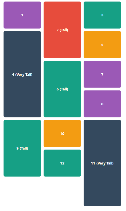 .item:nth-child(3n) { background-color: #16a085; } .item:nth-child(5n) { background-color: #f39c12; } </style> <div class="container"> <div class="item">1</div> <div class="item tall">2 (Tall)</div> <div class="item">3</div> <div class="item very-tall">4 (Very Tall)</div> <div class="item">5</div> <div class="item tall">6 (Tall)</div> <div class="item">7</div> <div class="item">8</div> <div class="item tall">9 (Tall)</div> <div class="item">10</div> <div class="item very-tall">11 (Very Tall)</div> <div class="item">12</div> </div>