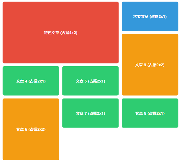 .magazine-layout > div { padding: 20px; border-radius: 8px; color: white; font-weight: bold; font-size: 1.2rem; display: flex; align-items: center; justify-content: center; } </style> <div class="magazine-layout"> <div class="featured">特色文章 (占据4x2)</div> <div class="secondary">次要文章 (占据2x1)</div> <div class="tertiary tall">文章 3 (占据2x2)</div> <div class="tertiary">文章 4 (占据2x1)</div> <div class="tertiary">文章 5 (占据2x1)</div> <div class="tertiary tall">文章 6 (占据2x2)</div> <div class="tertiary">文章 7 (占据2x1)</div> <div class="tertiary">文章 8 (占据2x1)</div> </div>