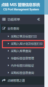 5.进入系统之后,在左侧功能菜单里点击“采购入库计划及标签打印”