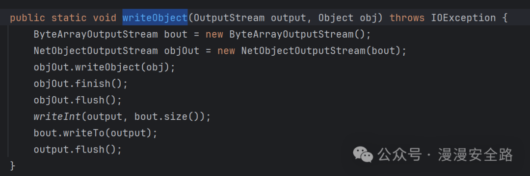 他先检查了前四字节然后使用前四字节计算了数据长度判断是否符合,最后使用nc.bs.framework.comn.NetObjectInputStream#readObject进行反序列化。这里我们可以直接套用它的序列化方法来进行序列化数据的生成nc.bs.framework.comn.NetObjectOutputStream#writeObject