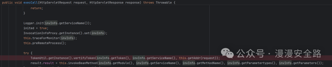 从我们反序列化的对象invInfo中获取数据先进入vertifyToken进行token验证,然后进入invokeBeanMethod进行反射调用。我们看下vertifyToken的实现