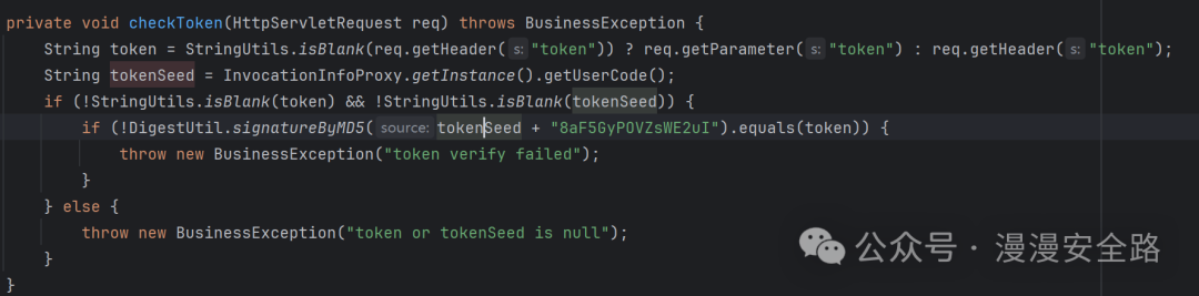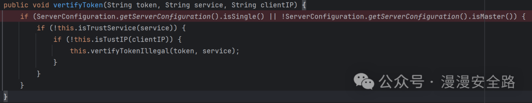 如果service或者clientIP在可信列表里则直接不进行token验证,然后看vertifyTokenIllegal怎么验证token