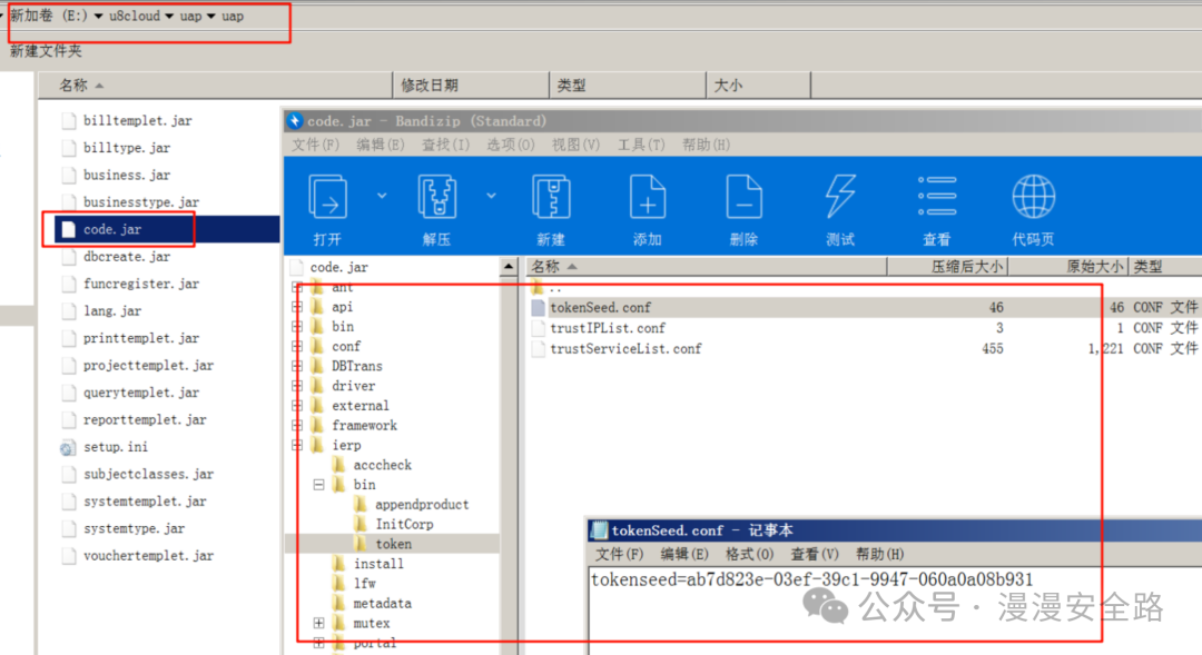 从nc.bs.framework.server.token.TokenUtil可知tokenSeed储存在/ierp/bin/token/tokenSeed.conf里我们直接查看安装包和安装后的这个文件发现没有任何变化说明是硬编码的不是启动后随机生成写入文件的。