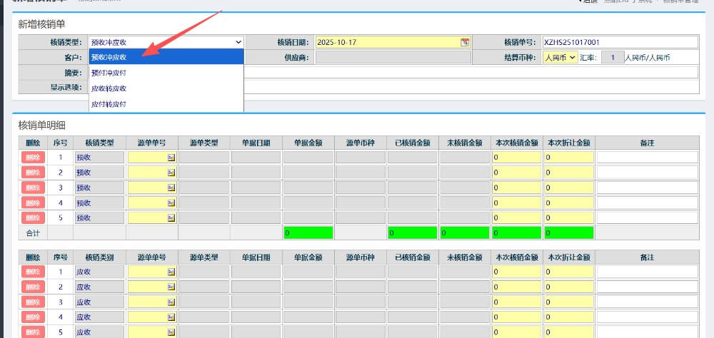 操作步骤:FMS-应收应付-核销单-新增核销单,如下图所示: