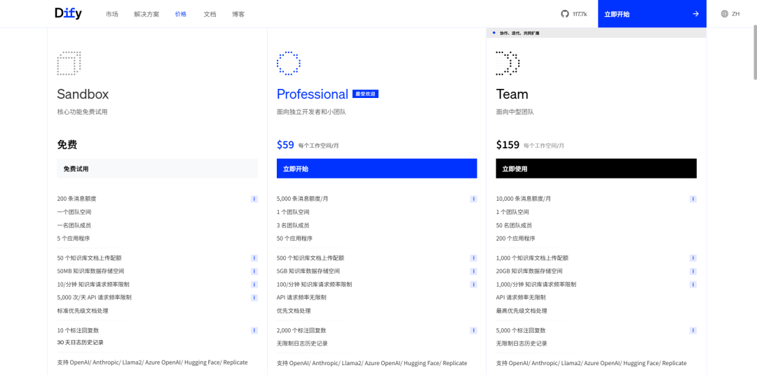 Dify 收费情况使用中的成本应当关注 详情见官网计价: https://dify.ai/zh/pricing