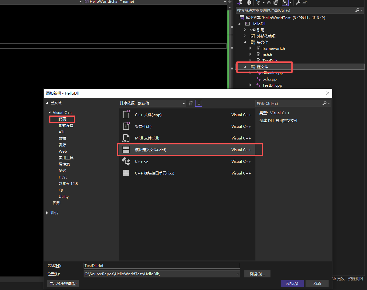 2、以模块定义文件的方式导出 在源文件上点击右键,选择添加-》新建项,然后选择 代码-》模块定义文件,添加TestDll.def 文件
