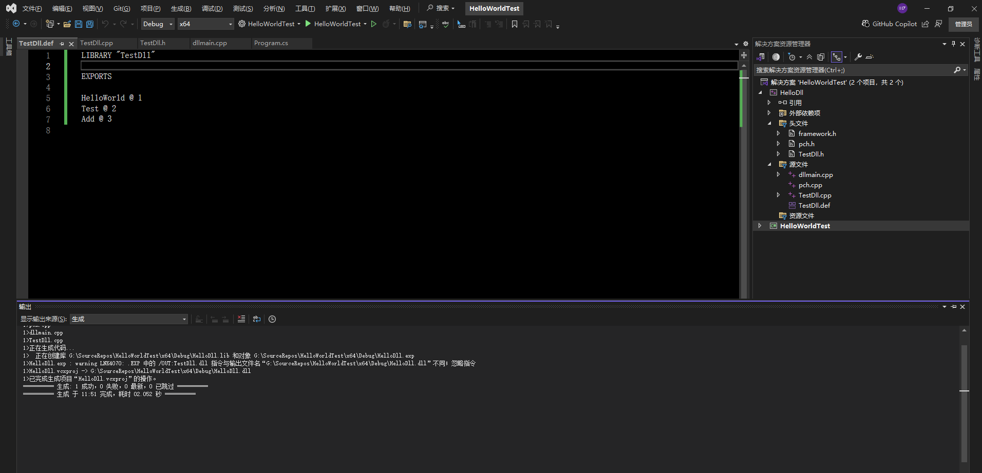 然后在 TestDll.cpp 文件 添加代码,如下 #include "pch.h" #include "TestDll.h" #include<iostream> void HelloWorld(char* name) { std::cout << "Hello World " << name << std::endl; } int Test() { return 666666; } int Add(int a, int b) { return a + b; }