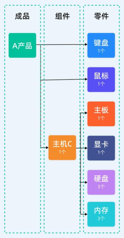 2、物料清单(BOM) 物料清单(BOM,Bill of Materials)是一份详细的列表,列出了生产最终产品所需要的所有原材料、部件及其数量。它就像是产品的“配方”或“食谱”,用来指导生产过程中需要哪些物料、数量及其顺序。BOM对于MRP系统非常重要,因为它帮助系统理解每种物料在生产过程中所扮演的角色,并计算出每个组件的需求。