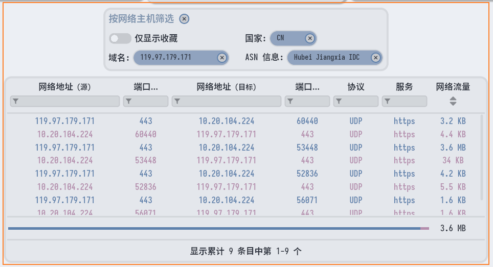 点开某一条主机信息,可以查看具体的流量细节,包含端口、协议等。