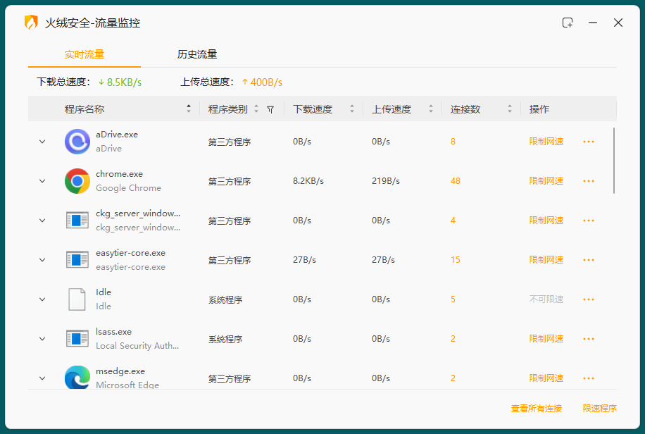 火绒的流量悬浮框可以查看应用程序(进程)的流量,而 sniffnet 主要关注通讯双方的IP以及端口。