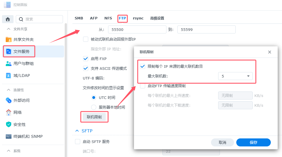 🔧 调整连接数限制群晖DSM系统允许你从两个层面来配置FTP的连接数,以控制并发访问量。