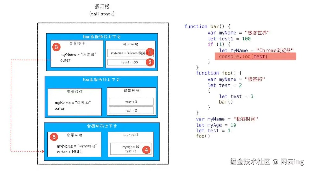 bar内部if块的console.log(test),先查自身块级词法环境(只有myName="Chrome 浏览器")→ 没找到;