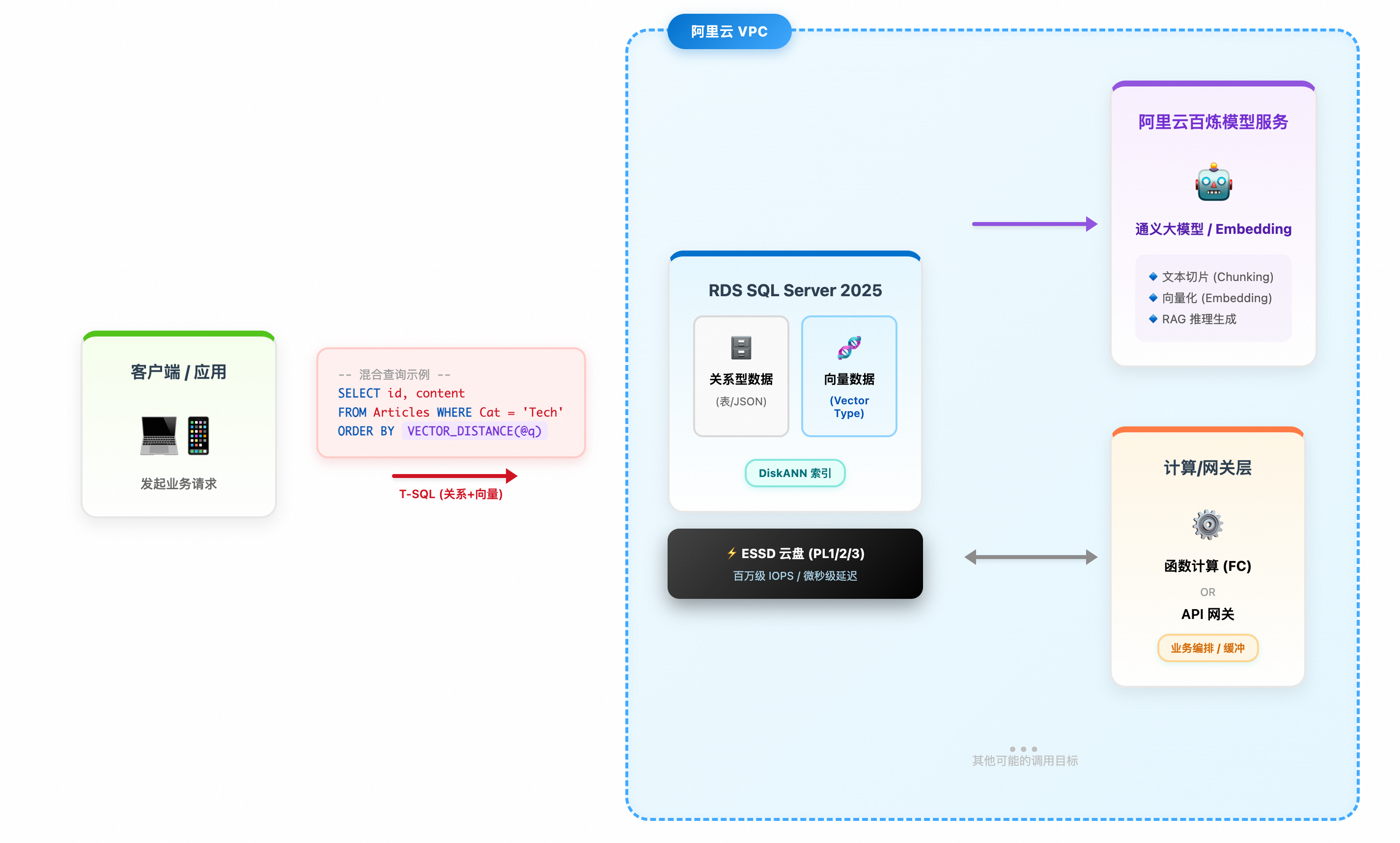 新SQL Server 2025 AI能力在RDS上的应用对于阿里云 RDS 来说,一个非常直接的落地方式是:把 SQL Server 2025 当作“业务库 + 向量库”的统一承载层,底层配 ESSD PL1/PL2 乃至 PL3 盘型,利用高 IOPS 和低延迟支撑 DiskANN 的随机访问;在同一专有网络内,通过函数计算(FC)或 API 网关对接百炼上的通义大模型,将切片、Embedding、RAG 推理全部收束在一条内网链路中。相比“业务库 + 外挂向量库 + 外网模型服务”的三层架构,这种“RDS 向量库 + 内网大模型”的组合可以明显降低运维复杂度和链路风险。 一个可能的架构如下图所示: