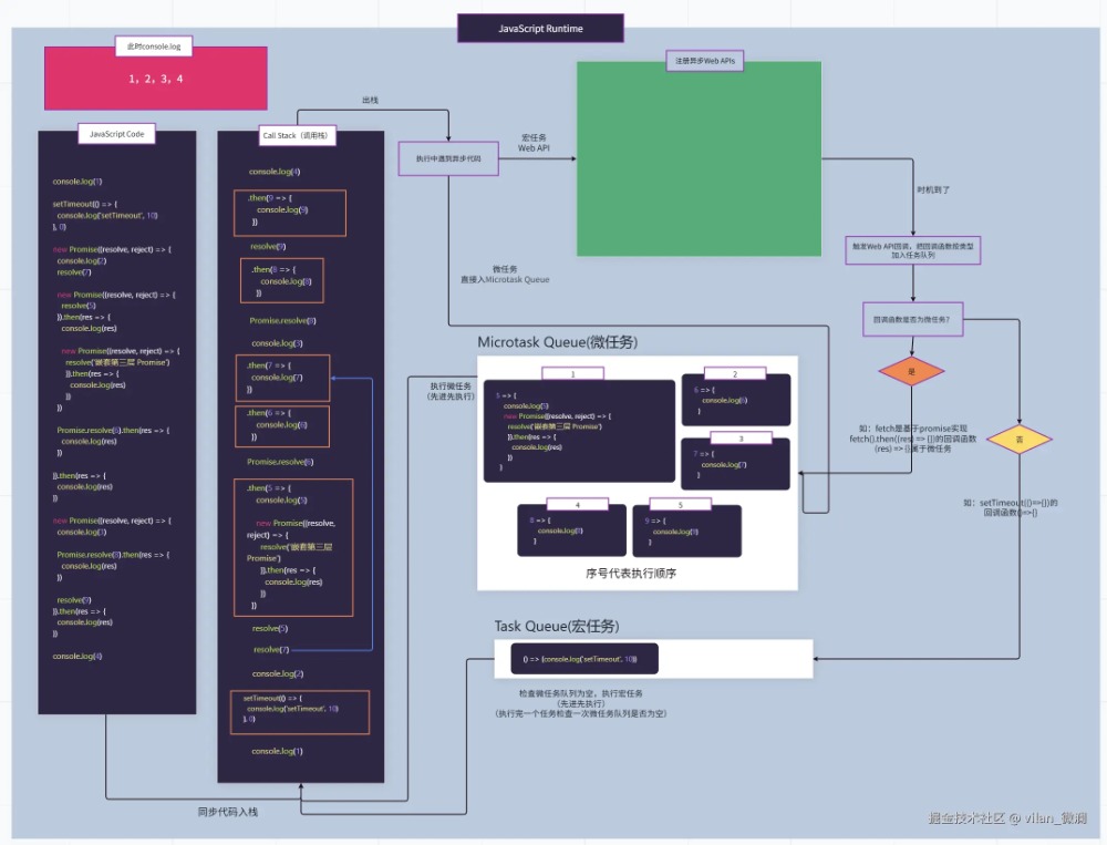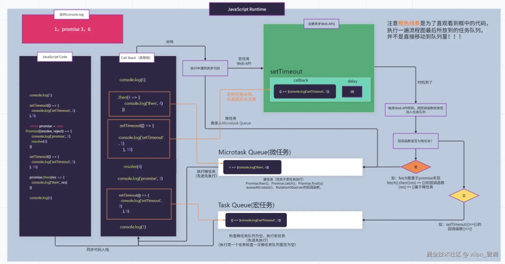 这可能只是简单的JavaScript代码执行事件循环流程,目的也是让大家更直观理解其中原理。实际执行过程可能还会读取堆内存获取引用类型数据、操作dom的方法,可能还会触发页面的重排、重绘等过程、异步文件读取和写入操作、fetch发起网络请求,与服务器建立连接获取网络数据等情况。