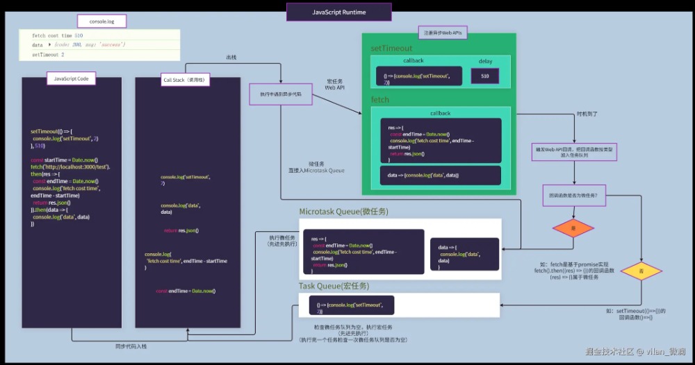 下图当前Call Stack执行栈执行完同步代码后,由于fetch和setTimeout都是宏任务,所以走宏任务Web API流程后注册这两个事件回调,等待定时到后了,由于定时回调是个普通的同步函数,所以放到宏任务队列;等待fetch拿到服务器响应数据后,由于fetch回调为一个Promise对象,所以放到微任务队列。
