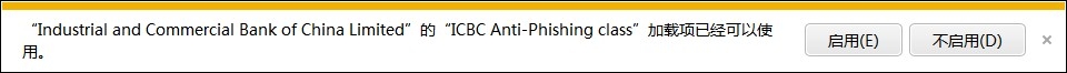 为了不影响IE浏览器打开的速度,一般情况我们会把一些不经常用的IE加载项给禁用了,等到需要的时候在启动。但是如果你安装了工商银行网上银行加载项,那么你就悲剧了。 该加载项启动占用时间太长就算了,想着那就暂时先禁用他吧。然后打开“工具”-> “管理加载项”,在里面找到 ICBC Anti-Phishing class 加载项将其禁用,以为至此就OK了。 无奈以后每次启动IE9的时候,他都会弹出“ICBC Anti-Phishing class” 加载项是否要启用还是不启用的提示: